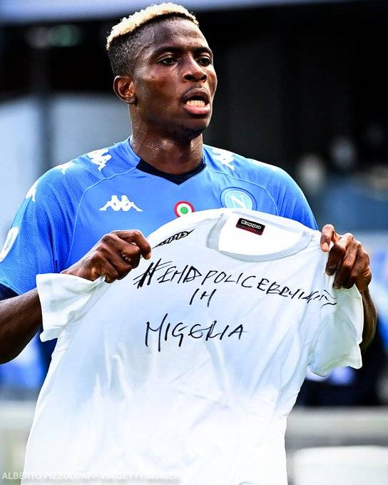Super Eagles forward and Napoli star, Victor Osimhen today, celebrates his first goal for Napoli in the Serie A with the hash tag #EndPoliceBrutalityinNigeria.