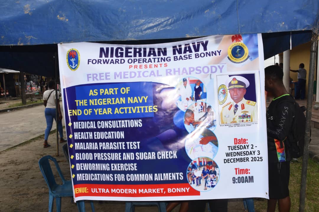 The Executive Officer of the Nigerian Navy Forward Operating Base (FOB) Bonny, Commander Mohammed Mustapha mentioned this on Tuesday, December 2, 2025 during an ongoing medical rhapsody organized by the Base at the Bonny Ultra Modern Market in Bonny, Rivers State.