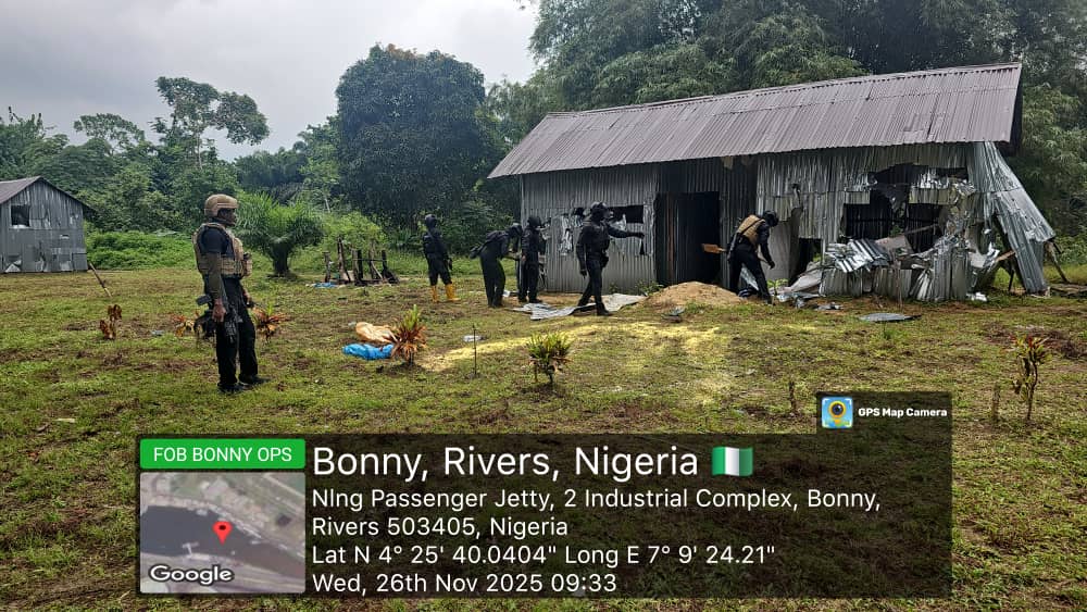 “On Wednesday 26 November 2025, FOB BONNY anti-militancy Team in conjunction with 115 Special Operations Group Nigerian Air Force, raided an identified criminal’s camp at Asaramatoru Community. During the raid, 3 persons were arrested in connection with the Camp.”