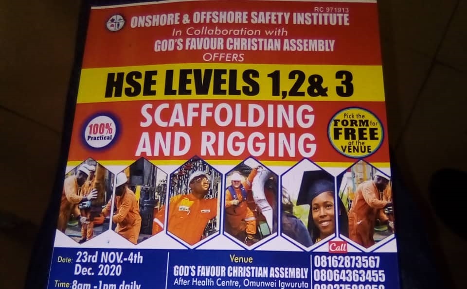 In a bid to develop the skills sets of the people of Igwuruta in Ikwerre Local Government of Rivers State, the Onshore and Offshore Safety Institute, in collaboration with God’s Favour Christian Assembly, is organizing a one week intensive safety training for all residents of the community and its environs.